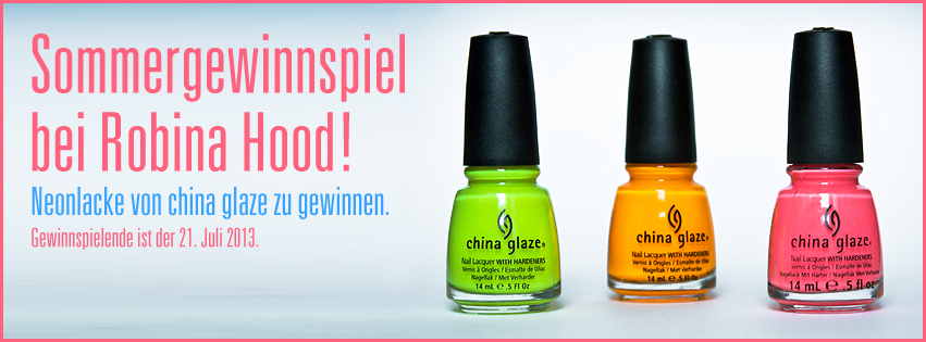 Der Betreff lautet „china glaze“. Teilnahmeschluss ist der 21. Juli 2013, 23:59 Uhr. In dieser Mail ist ebenfalls der Facebook-Nutzername zu nennen, unter dem die Facebookseite von Robina Hood geliked wurde, da sich das Gewinnspiel ausschließlich an die Facebookfans von Robina Hood richtet.