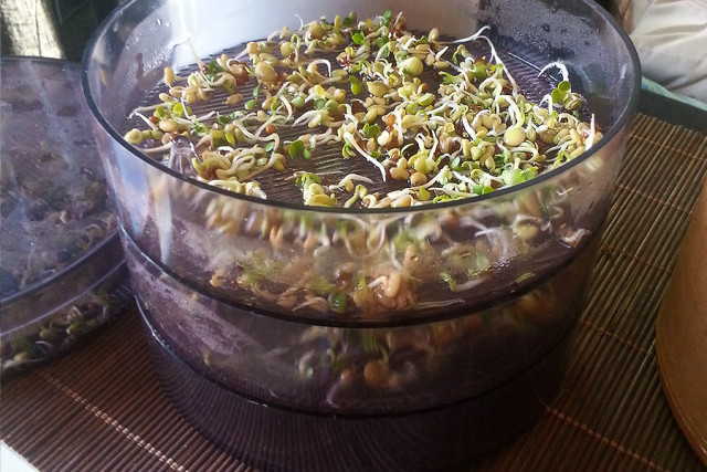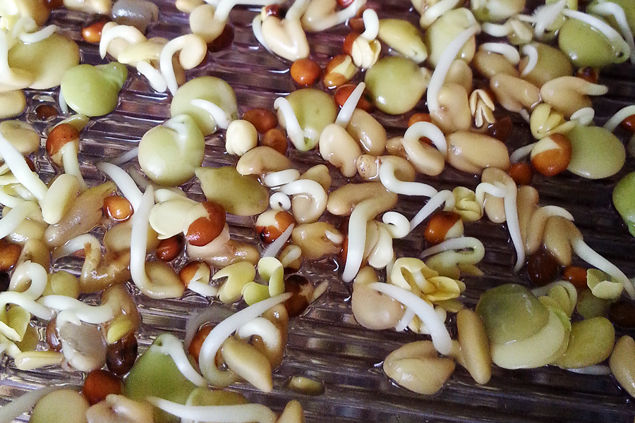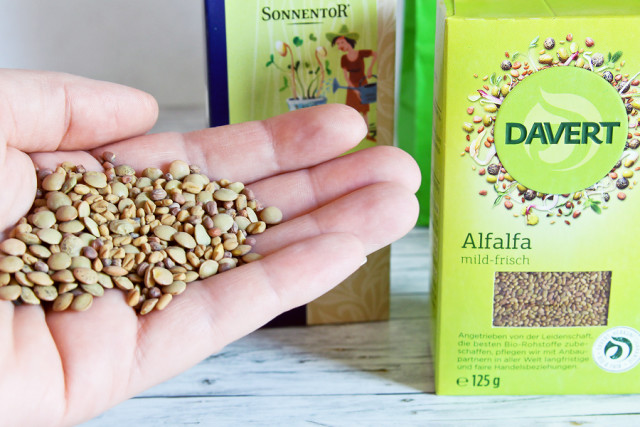 Links zu sehen das Sprossenhaus, rechts daneben eine Auswahl von Samen, die ich daheim habe (ganz hinten Kresse, links und rechts Alfalfa und davor einen Mix). Bei gemischten Sprossen wird so manches Mal von Amazon-Rezensenten bemängelt, dass die Samen zu unterschiedlichen Zeiten keimen würden. Im Großen und Ganzen ist das richtig, aber eher unerheblich. Es ist in jedem Falle möglich, alle zum Keimen zu bekommen und auch zu verzehren.
