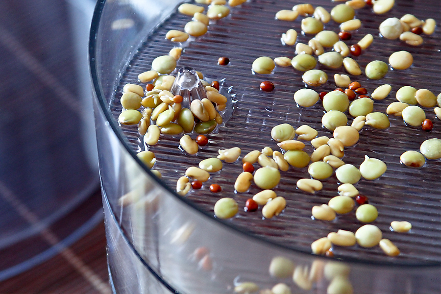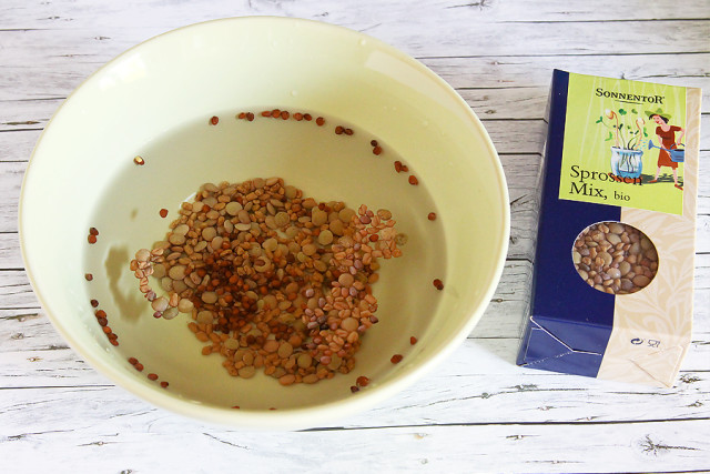 - Ungefähr zwei große Esslöffel der Samen (in meinem Fall der Sprossenmix von Sonnentor) reichen für alle drei Schalen des Sprossenhauses. Diese Samen einfach in eine Schüssel geben und mit Wasser übergießen. Packunghinweise beachten und nach der angegebenen Zeit quellen lassen. Beim Sonnentor-Sprossenmix 6 – 8 Stunden.