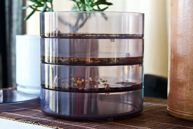 - Morgens und abends spült man die Samen ab. Dazu nimmt man sich ein großes Wasserglas (ich habe ein 500-ml-Glas), füllt es mit Wasser und gießt es nach dem Abnehmen des Deckels in die oberste Etage. So werden die Samen immer gespült. Das Wasser läuft duch die Kegelchen, die ihr im Bild seht, ab und wandert so von der obersten bis zur untersten Etage.
