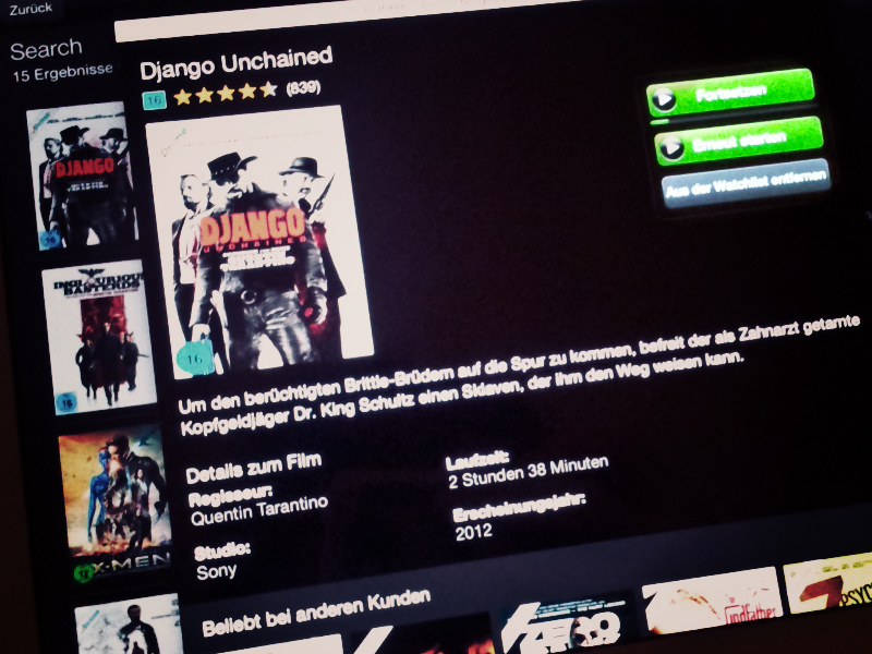 Zu meiner großen Verwunderung konnten mein Freund und ich letzte Woche „Django Unchained“ ansehen, was vor kurzer Zeit noch nicht möglich war. Zumindest nicht ohne zusätzliche Kosten. Die Tribute von Panem I+II gibt ebenfalls im Angebot. Aktuelles wie „Stromberg – Der Film“ oder „sucht man allerdings vergeblich. *schnief*