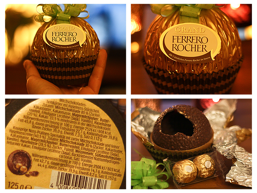 Sie wirklich toll aus, eignet sich perfekt als Mitbringsel und kleines Präsent, schmeckt toll und überhaupt … ich mag es. :D Würde ich es mir selbst kaufen? Wohl eher nicht. Darüber freut man sich eher, wenn man es geschenkt bekommt. Preislich liegt es bei 3,95 €. Ist also auch nicht gerade günstig. Wenn man sich „vollstopfen“ will, sollte man lieber zu den normalen Rochers greifen. War aber in jedem Fall ein wirklich schönes Präsent. : )