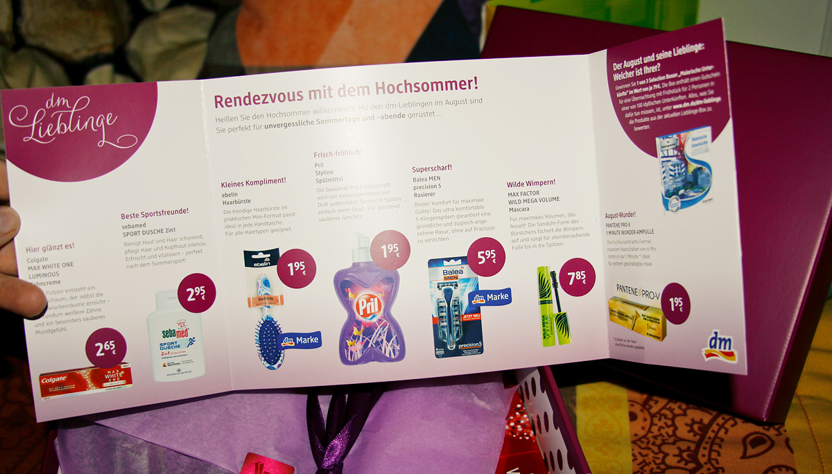 Für alle, die gerne so eine Box hätten: Auf der Facebookseite von dm Drogeriemarkt Deutschland wird rechtzeitig bekannt gegeben, wann man sich für ein 3-Monats-Abo der Box bewerben bzw. anmelden kann. Zur Verfügung stehen in jeder Abophase 5000 Boxen, die unter allen Teilnehmern per Zufall verlost werden. Um der großen Anmeldewelle gerecht zu werden, schließt dm bei jeder neuen Aboanmeldung die „Abogewinner“ aus der vorherigen Phase aus. Nicht schön, aber fair. ;)