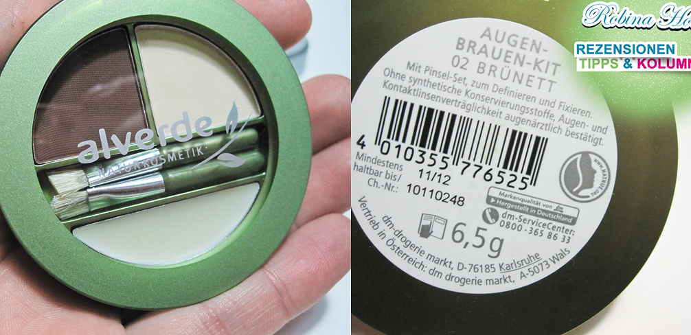 Dann hätten wir noch das Augenbrauen-Kit, das ich in der Farbe 02 Brünett gekauft habe. Die Farbe 01 Blond ist auch noch zu haben. Vorerst etwas skeptisch, ob ich die tatsächlich für die kräftige braune Farbe passenden Augenbrauen habe, zeigte sich schnell, dass sich hinter diesem Kit ein wahres kleines Wunder verbirgt. Die Farbe passt perfekt! Ob jetzt einige Nutzerinnen des Kits die beiden Farben, die im Set enthalten sind, mischen, um ihre Brauen zu betonen oder den hellen Beigeton als eine Art Highlighter-Farbe unterhalb der Augenbrauen nutzen, um diese sauber abzugrenzen, wird sich demnächst in anderen Testberichten zeigen, worauf ich schon sehr gespannt bin. Die beiden Applikatoren halte ich für borstige Zeigenossen, die ich nicht unbedingt haben muss. Die Pinselchen sind sehr strohig, struppig und hart und reissen beim Abstreichen aus den Pfännchen kleine Krater in die Farben. Da nehme ich lieber meinen gewohnten abgeschrägten Pinsel. Das Wachs ist für mich eine gelungene Ergänzung zu den beiden Farben. Als Finish aufgetragen hält die Augenbrauenfarbe so lange, bis man sich wieder abschminkt. Wirklich ein gelungenes neues Produkt!