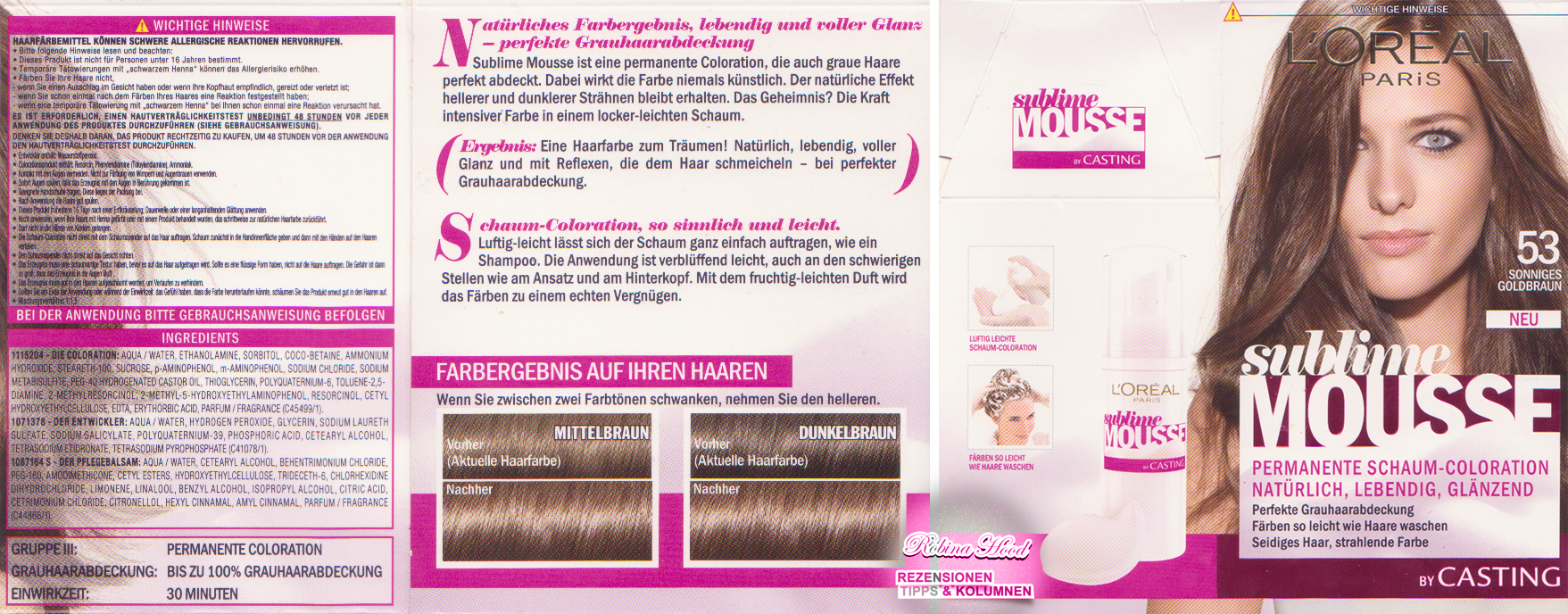 Heute Vormittag probierte ich die L’Oréal Paris Sublime Mousse Schaumcoloration in der Farbe „53 SONNIGES GOLDBRAUN“, die ich über amazon für 6,45 € bestellte.