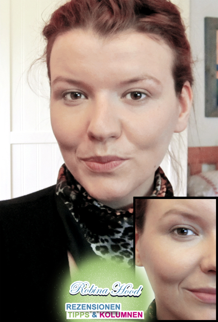 Jetzt habe ich noch zwei Fotos für Euch. Einmal bin ich komplett ohne Make-Up, nur mit der p2-Perfect-Face-Base und dem neuen Mineral-Puder von alverde geschminkt und dann komplett geschminkt nach einem langen Tag. Das Make-up hielt mehr als 14 Stunden durch. Verzeiht mir die unterschiedlichen Lichtsituationen. Auf dem ersten Foto war es irgendwann in den Vormittagsstunden und auf dem zweiten Foto, das ich im Bad aufnahm, gegen 2 Uhr nachts. Dafür sah ich doch noch recht vernünftig aus. Da war ich vormittags weitaus müder. ;D