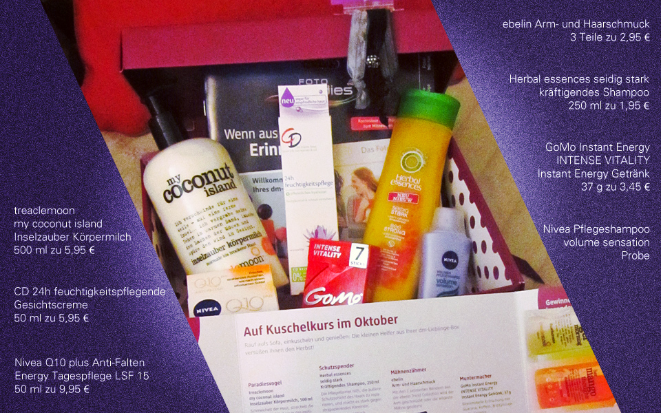 Ungewöhnlich früh kamen also auch die dm Lieblinge für den Oktober 2013; die letzte Box der jetzigen Aboreihe. Den Inhalt möchte ich euch kurz vorstellen: