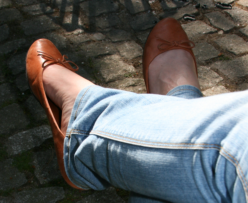 Mittlerweile besitze ich zwei Paar Ballerinas. Einmal in Cognacbraun und einmal in zeitlosem Schwarz, wobei ich grad nur Braun trage, um nicht gänzlich in dunklen Tönen durch den Sommer zu wandeln. Schwarze Ballerinas, weiße Hose und schwarze Bluse sehen sicher auch schick aus. Scheitert bei mir nur an der weißen Hose, da ich fleckfeindlich gesonnen bin und mir ein Fleck auf heller Kleidung den ganzen Tag versauen könnte. ;D