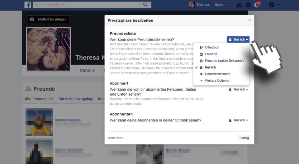 5. Es öffnet sich ein Pop-up und euer eigentliches Profil wird abgedunkelt im Hintergrund dargestellt. Jetzt unter „Wer kann deine Freundesliste sehen?“ den Haken bei „nur ich“ setzen und eure Freundesliste ist für andere uneinsehbar.
